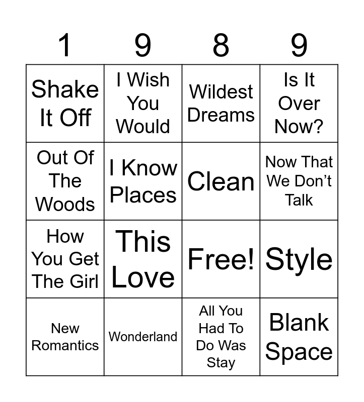 This bingo card has 19 words: Free!, Bad Blood, Wildest Dreams, Blank Space, Style, Out Of The Woods, All You Had To Do Was Stay, Shake It Off, I Wish You Would, How You Get The Girl, This Love, I Know Places, Clean, Wonderland, New Romantics, You Are In Love, Is It Over Now?, Now That We Don’t Talk and Welcome To New York.