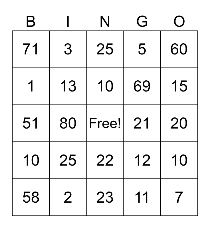 This bingo card has a free space and 24 words: 25, 2, 10, 58, 60, 71, 1, 3, 21, 22, 69, 51, 12, 10, 13, 11, 20, 25, 15, 80, 7, 10, 5 and 23.