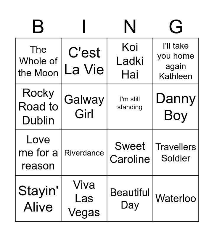 This bingo card has 26 words: Whiskey in a Jar, Brown Eyed Girl, Danny Boy, Molly malone, Rocky Road to Dublin, The Whole of the Moon, Galway Girl, C'est La Vie, Beautiful Day, Breathless, Love me for a reason, Sweet Caroline, Is this the way to Amarillo?, That's Amore, Travellers Soldier, Grace, I'll take you home again Kathleen, Waterloo, Koi Ladki Hai, Stayin' Alive, Riverdance, Twist and Shout, Viva Las Vegas, Pretty Woman, I'm still standing and Sway.