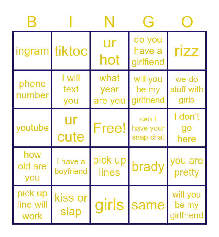 This bingo card has a free space and 25 words: pick up line will work, I have a boyfriend, what year are you, same, we do stuff with girls, ingram, tiktoc, ur hot, will you be my girlfriend, you are pretty, youtube, I will text you, brady, will you be my girlfriend, phone number, kiss or slap, girls, do you have a girlfiend, I don't go here, how old are you, ur cute, pick up lines, can I have your snap chat, rizz and songbird.