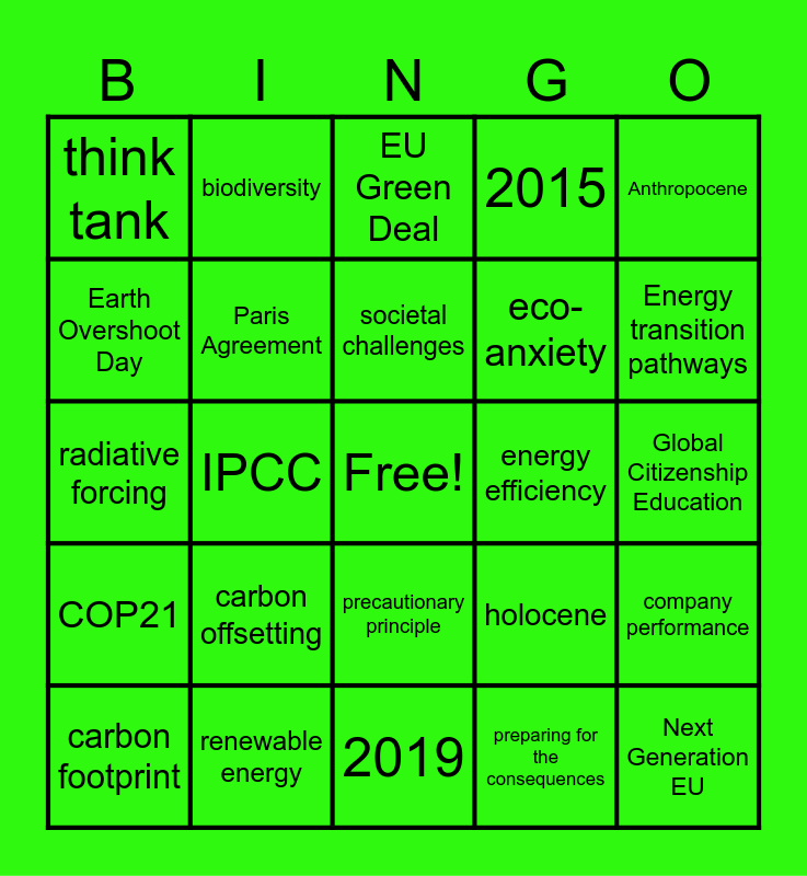 This bingo card has a free space and 29 words: carbon footprint, circular economy, IPCC, IPBES, think tank, EU Green Deal, Paris Agreement, carbon offsetting, energy efficiency, renewable energy, Global Citizenship Education, Next Generation EU, 2019, preparing for the consequences, Energy transition pathways, energy sobriety, precautionary principle, COP21, Anthropocene, radiative forcing, holocene, greenhouse gases, eco-anxiety, Earth Overshoot Day, 2015, biodiversity, company performance, societal challenges and label RSE.