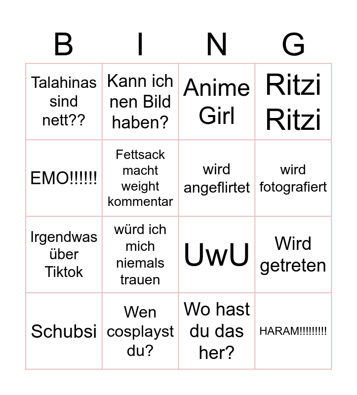 This bingo card has 18 words: EMO!!!!!!, Wen cosplayst du?, Anime Girl, Ritzi Ritzi, Irgendwas über Tiktok, Kann ich nen Bild haben?, UwU, wird fotografiert, Talahinas sind nett??, würd ich mich niemals trauen, Wo hast du das her?, Wird getreten, Schubsi, Fettsack macht weight kommentar, wird angeflirtet, HARAM!!!!!!!!!, Talahinas sind nett??? and Lehrer macht Kompliment.