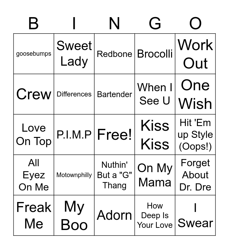 This bingo card has a free space and 40 words: Are You That Somebody, Love On Top, Bills, Bills, Bills, Differences, My Boo, Nuthin' But a "G" Thang, Bartender, Return of the Mack, Work Out, All Eyez On Me, P.I.M.P, Brocolli, I Swear, Hit 'Em up Style (Oops!), Kiss Kiss, Motownphilly, The Way You Move, goosebumps, The Boy Is Mine, Redbone, Forget About Dr. Dre, How Deep Is Your Love, When I See U, Crew, Between the Sheets, I Wanna Know, Love, ZEZE, Fantasy, Superstition, Weak, Freak Me, Can We Talk, On My Mama, One Wish, Adorn, Confessions, Pt. II, Bad and Noujee, Sweet Lady and Thong Song.
