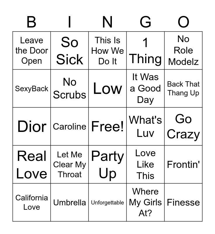 This bingo card has a free space and 39 words: Drunk in Love, Pony, Hypnotize, No Scrubs, California Love, Party Up, Low, Brick House, No Role Modelz, Real Love, Caroline, 1 Thing, Finesse, Go Crazy, What's Luv, Let Me Clear My Throat, SICKO MODE, Leave the Door Open, Let It Whip, Love Like This, SexyBack, Unforgettable, It Was a Good Day, Back That Thang Up, Doo Wop (That Thing), Get Low, Sexual Healing, Love Train, P.Y.T, So Sick, How Will I Know, Blinding Lights, This Is How We Do It, Umbrella, Where My Girls At?, Take You There, Frontin', Dior and Yeah!.