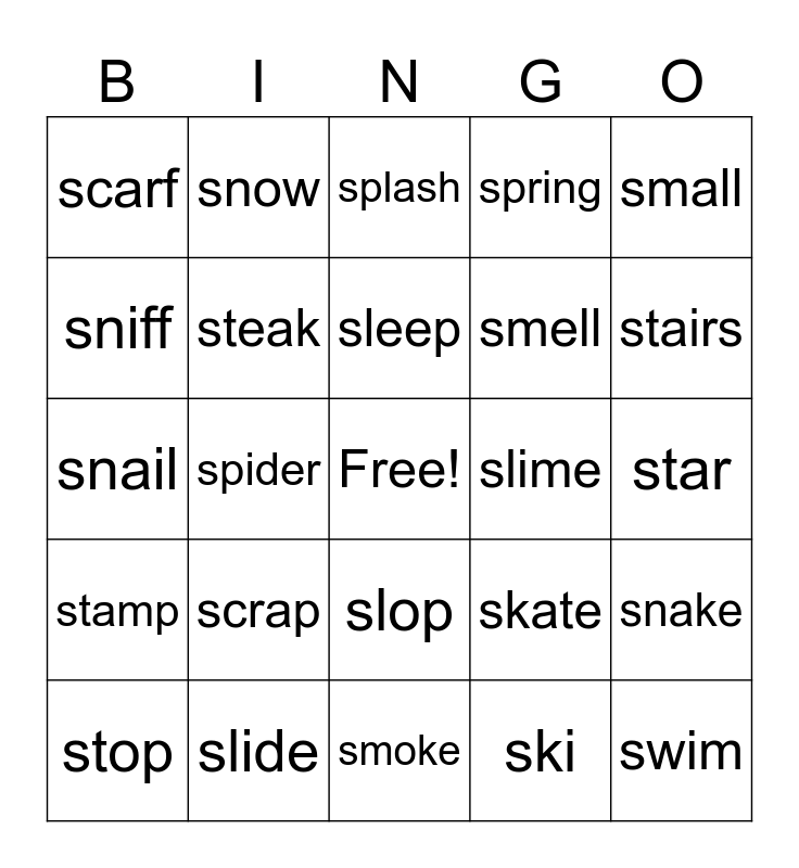 This bingo card has a free space and 44 words: snap, swim, squid, stop, spin, ski, splash, sled, small, slide, spring, slime, slop, scrap, stripes, smoke, snow, snail, sweat, stairs, snow, spots, shirt, scarf, stop, star, switch, spoon, skate, stamp, swing, snake, ski, skirt, spider, sprout, swan, stir, sleep, sniff, smell, spill, steak and shell.