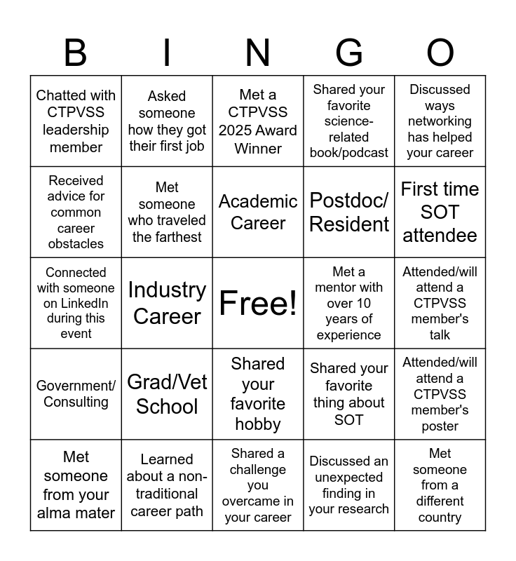 This bingo card has a free space and 24 words: Grad/Vet School, Learned about a non-traditional career path, Academic Career, Met someone from your alma mater, Discussed ways networking has helped your career, Chatted with CTPVSS leadership member, Received advice for common career obstacles, Asked someone how they got their first job, Met a mentor with over 10 years of experience, Shared your favorite hobby, Postdoc/ Resident, Connected with someone on LinkedIn during this event, Shared your favorite thing about SOT, Attended/will attend a CTPVSS member's poster, Met someone who traveled the farthest, Discussed an unexpected finding in your research, Attended/will attend a CTPVSS member's talk, Met a CTPVSS 2025 Award Winner, First time SOT attendee, Industry Career, Met someone from a different country, Government/ Consulting, Shared your favorite science-related book/podcast and Shared a challenge you overcame in your career.