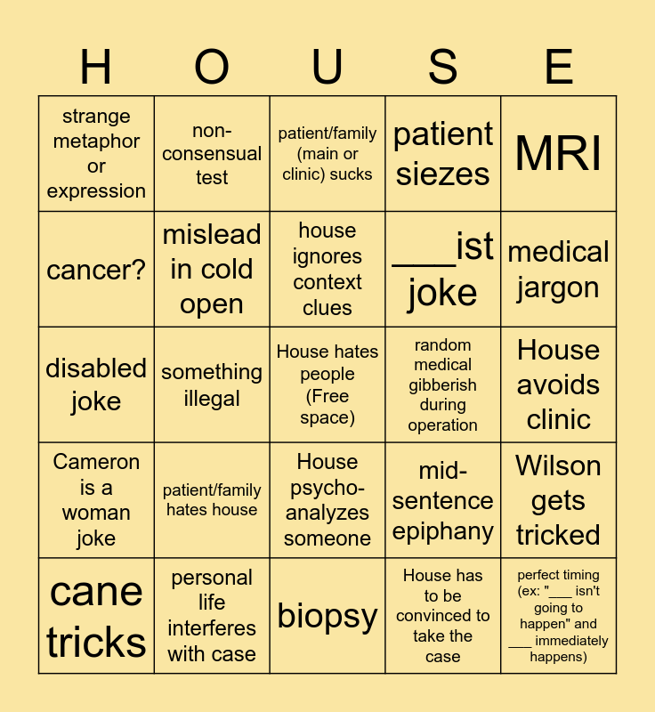 This bingo card has a free space and 57 words: House pops a pill, cane tricks, Cuddy gets mad, strange metaphor or expression, biopsy, patient can't breathe, mislead in cold open, Something unethical, ___ist joke, Hilson, patient siezes, House has an epiphany in the clinic, I hate the australian one, house sexualizes someone, patient hides something important, Cameron gets belittled or patronized, MRI, something illegal, organ failure, perfect timing (ex: "___ isn't going to happen" and ___ immediately happens), random medical gibberish during operation, one of the ducklings throws out a random guess, mid-sentence epiphany, patient/family (main or clinic) sucks, inner body view, house ignores context clues, whiteboard, treatment without diagnosis, medical jargon, treatment almost kills patient, team defies house, large loss of blood, misdiagnosis, cameron is the only one with a heart, House avoids clinic, cancer?, elevator scene, disabled joke, Foreman is black joke, Cameron is a woman joke, non-consensual test, House psycho-analyzes someone, Wilson psycho-analyzes house, house disobeys Cuddy, House is mean to patient/family, House is nice to someone (likely ironically or sarcastically), patient/family hates house, personal life interferes with case, patient is a kid, pacing, House's office, House has to be convinced to take the case, House is unserious, sexual tension, house lies to patient, Wilson gets tricked and house sexualizes cuddy.