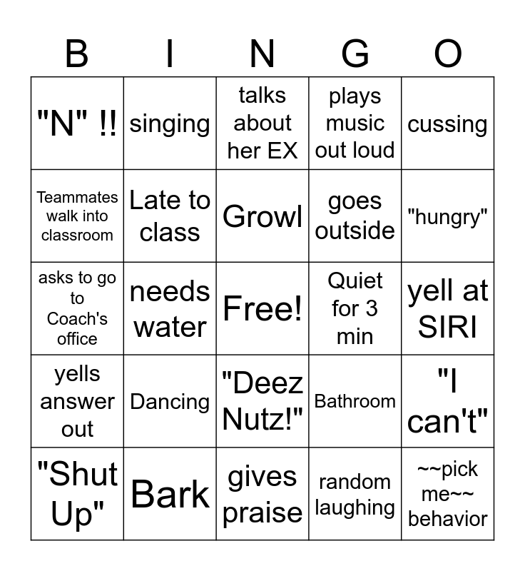 This bingo card has a free space and 24 words: Dancing, Bark, Growl, "Shut Up", cussing, "N" !!, Teammates walk into classroom, singing, Quiet for 3 min, "Deez Nutz!", goes outside, asks to go to Coach's office, Bathroom, "I can't", Late to class, random laughing, yell at SIRI, talks about her EX, "hungry", needs water, ~~pick me~~ behavior, yells answer out, plays music out loud and gives praise.