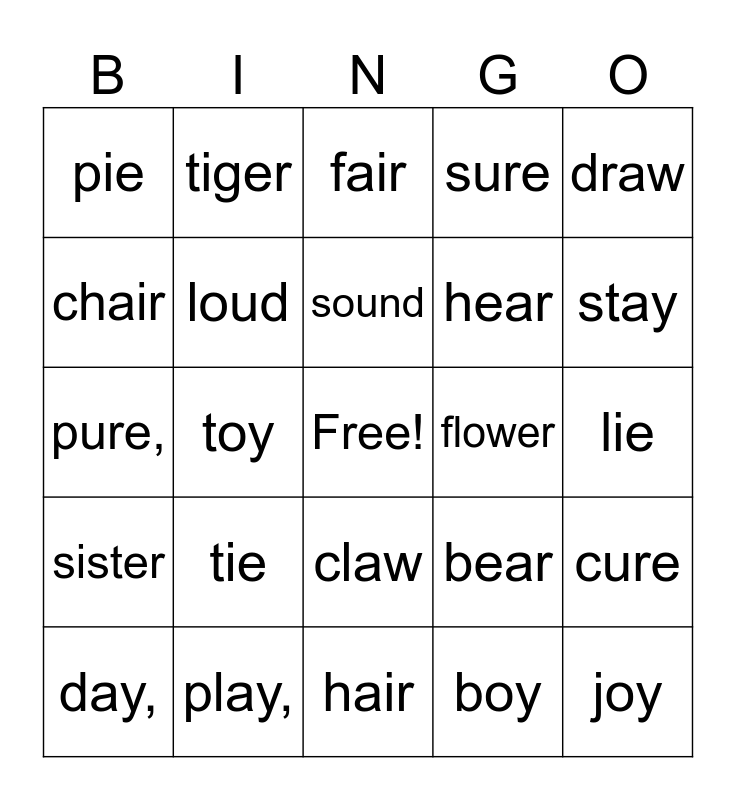 This bingo card has a free space and 27 words: bear, pear, hear, hair, chair, fair, tiger, sister, flower, cure, pure,, sure, day,, play,, stay, cloud, loud, sound, tie, pie, lie, boy, toy, joy, claw, draw and straw.