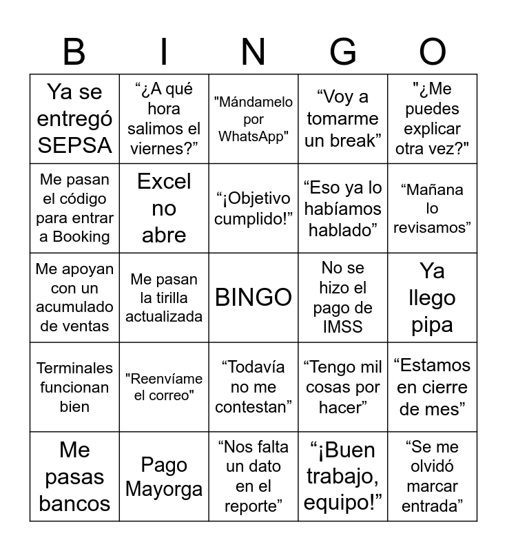 This bingo card has a free space and 29 words: Me pasas bancos, No soy Isela, Me pasan la tirilla actualizada, "¿Ya vieron el correo?", Ya se entregó SEPSA, "Mándamelo por WhatsApp", Excel no abre, "Reenvíame el correo", No se hizo el pago de IMSS, Pago Mayorga, Ya llego pipa, “Se me olvidó marcar entrada”, “Nos falta un dato en el reporte”, “¡Buen trabajo, equipo!”, “Mañana lo revisamos”, “¿Mañana es festivo?”, “Todavía no me contestan”, Terminales funcionan bien, "¿Me puedes explicar otra vez?", Me apoyan con un acumulado de ventas, “Tengo mil cosas por hacer”, “Lo terminamos antes del plazo”, “Eso ya lo habíamos hablado”, Me pasan el código para entrar a Booking, “Voy a tomarme un break”, “¿A qué hora salimos el viernes?”, “Estamos en cierre de mes”, “¡Objetivo cumplido!” and “¡Un aplauso para el equipo!”.