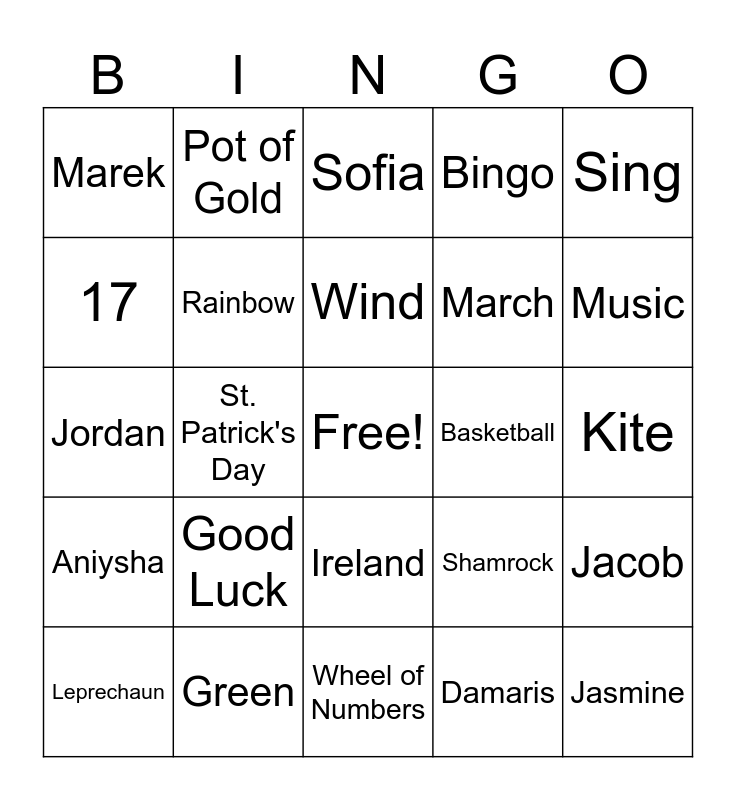 This bingo card has a free space and 24 words: Good Luck, Green, Wind, Leprechaun, Sing, Marek, 17, Pot of Gold, Basketball, Ireland, March, Jordan, Shamrock, Jacob, Rainbow, Damaris, Kite, Sofia, Music, St. Patrick's Day, Jasmine, Aniysha, Bingo and Wheel of Numbers.