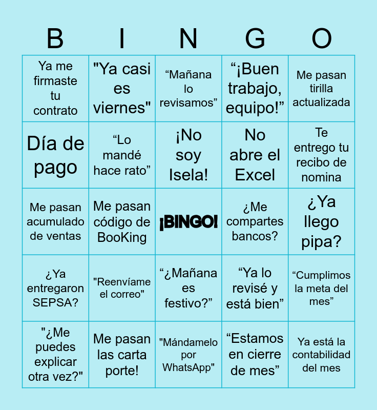 This bingo card has a free space and 29 words: “¡Un aplauso para el equipo!”, Me pasan las carta porte!, “Mañana lo revisamos”, “Se me olvidó marcar entrada”, Me pasan tirilla actualizada, Ya me firmaste tu contrato, “Lo mandé hace rato”, ¡No soy Isela!, ¿Me compartes bancos?, “Cumplimos la meta del mes”, "¿Me puedes explicar otra vez?", Me pasan código de BooKing, “Estamos en cierre de mes”, Ya está la contabilidad del mes, Me pasan acumulado de ventas, Es el pago de Mayorga, "Mándamelo por WhatsApp", “Ya lo revisé y está bien”, Te entrego tu recibo de nomina, ¿Ya entregaron SEPSA?, "Reenvíame el correo", "Reenvíame el correo", No abre el Excel, ¿Ya llego pipa?, Día de pago, "Ya casi es viernes", “¿Mañana es festivo?”, “¡Buen trabajo, equipo!” and “Tiempo récord en una reunión”.