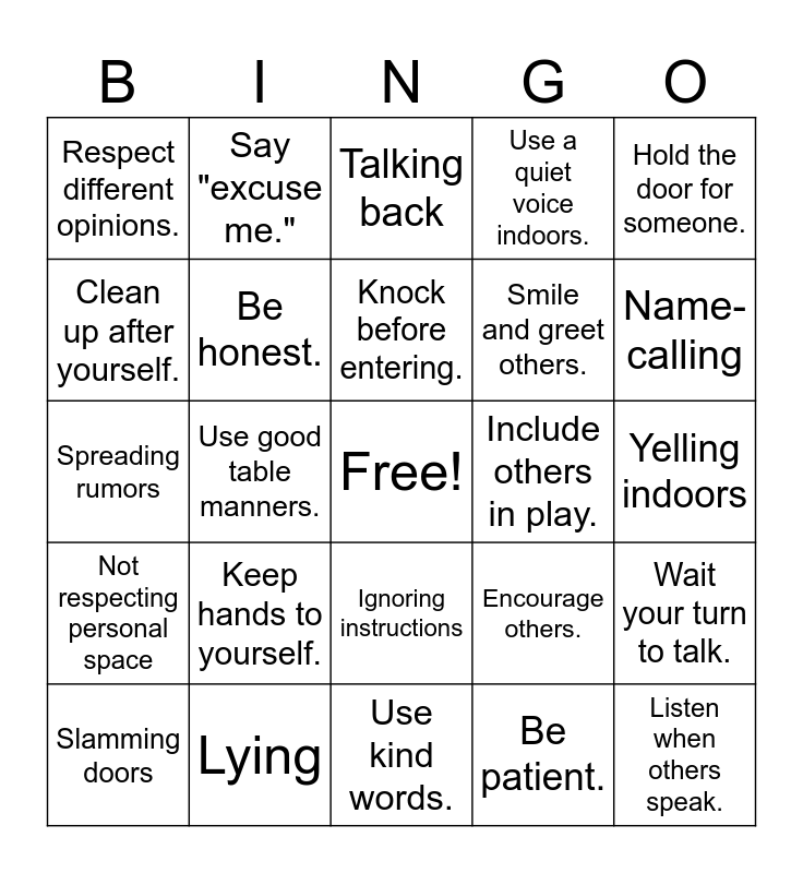 This bingo card has a free space and 50 words: Say "please" and "thank you.", Listen when others speak., Take turns and share., Use kind words., Keep hands to yourself., Follow directions., Say "excuse me.", Help a friend in need., Clean up after yourself., Respect personal space., Be honest., Use a quiet voice indoors., Wait your turn to talk., Encourage others., Respect school property., Be gentle with animals., Knock before entering., Include others in play., Say "I’m sorry" when needed., Hold the door for someone., Use good table manners., Be patient., Respect different opinions., Smile and greet others., Do your best work., Interrupting others, Name-calling, Pushing or shoving, Talking back, Ignoring instructions, Taking things without asking, Rolling eyes at others, Speaking over someone, Not sharing, Lying, Making fun of others, Leaving a mess, Using mean words, Excluding others, Yelling indoors, Laughing at mistakes, Not saying "please" or "thank you", Cutting in line, Not listening, Slamming doors, Spreading rumors, Being bossy, Hitting or kicking, Not respecting personal space and Ignoring someone talking to you.
