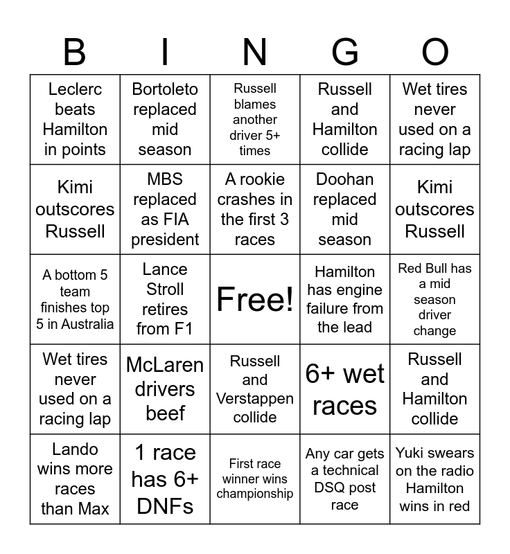 This bingo card has a free space and 45 words: Herta hired by Cadillac, Yuki swears on the radio Hamilton wins in red, Leclerc beats Hamilton in points, Lando wins more races than Max, Red Bull has a mid season driver change, Any car gets a technical DSQ post race, Russell blames another driver 5+ times, 6+ wet races, Wet tires never used on a racing lap, 1 race has 6+ DNFs, Russell and Hamilton collide, Hamilton has engine failure from the lead, Russell and Verstappen collide, McLaren drivers beef, Lance Stroll retires from F1, First race winner wins championship, Championship wrapped up by Japan, A bottom 5 team finishes top 5 in Australia, A rookie crashes in the first 3 races, Kimi outscores Russell, Bortoleto replaced mid season, Herta hired by Cadillac, Yuki swears on the radio Hamilton wins in red, Leclerc beats Hamilton in points, Lando wins more races than Max, Red Bull has a mid season driver change, Any car gets a technical DSQ post race, Russell blames another driver 5+ times, 6+ wet races, Wet tires never used on a racing lap, 1 race has 6+ DNFs, Russell and Hamilton collide, Hamilton has engine failure from the lead, Russell and Verstappen collide, McLaren drivers beef, Lance Stroll retires from F1, First race winner wins championship, Championship wrapped up by Japan, A bottom 5 team finishes top 5 in Australia, A rookie crashes in the first 3 races, Kimi outscores Russell, Doohan replaced mid season, A rookie wins a race, MBS replaced as FIA president and Hamilton stops in the wrong pit box.