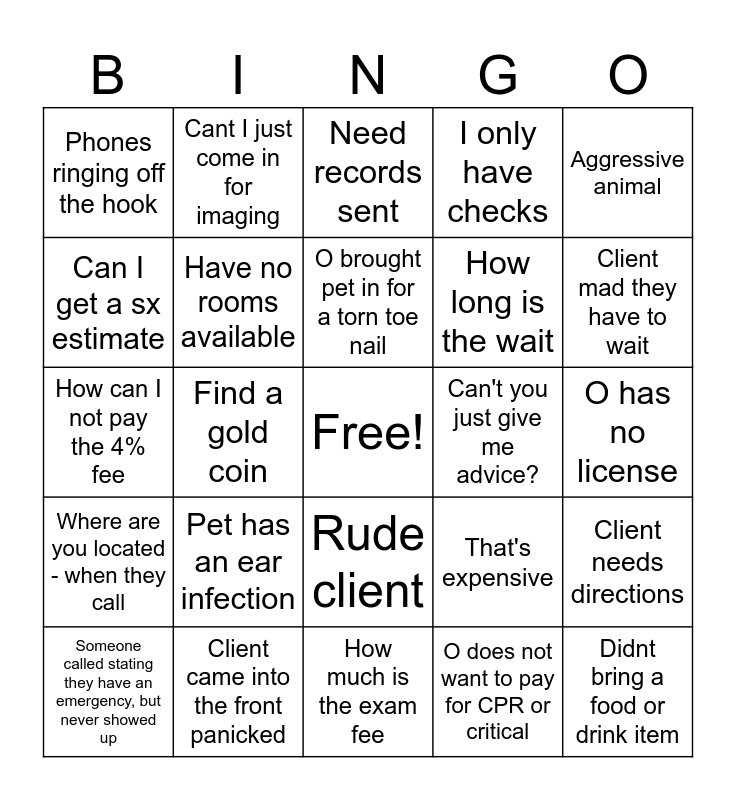 This bingo card has a free space and 27 words: That's expensive, Can I make an appointment for the ER, How long is the wait, How much is the exam fee, Can I get a sx estimate, Need records sent, Cant I just come in for imaging, Where are you located - when they call, Can't you just give me advice?, Client needs directions, How can I not pay the 4% fee, I only have checks, Someone called stating they have an emergency, but never showed up, Client came into the front panicked, Client mad they have to wait, Front Lobby is full, Have no rooms available, O brought pet in for a torn toe nail, Pet has an ear infection, Phones ringing off the hook, O has no license, O does not want to pay for CPR or critical, Find a gold coin, Didnt bring a food or drink item, Rude client, Aggressive animal and pet bleeding on the floor/ground.