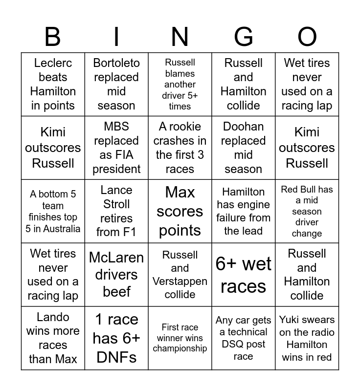 This bingo card has a free space and 45 words: Herta hired by Cadillac, Yuki swears on the radio Hamilton wins in red, Leclerc beats Hamilton in points, Lando wins more races than Max, Red Bull has a mid season driver change, Any car gets a technical DSQ post race, Russell blames another driver 5+ times, 6+ wet races, Wet tires never used on a racing lap, 1 race has 6+ DNFs, Russell and Hamilton collide, Hamilton has engine failure from the lead, Russell and Verstappen collide, McLaren drivers beef, Lance Stroll retires from F1, First race winner wins championship, Championship wrapped up by Japan, A bottom 5 team finishes top 5 in Australia, A rookie crashes in the first 3 races, Kimi outscores Russell, Bortoleto replaced mid season, Herta hired by Cadillac, Yuki swears on the radio Hamilton wins in red, Leclerc beats Hamilton in points, Lando wins more races than Max, Red Bull has a mid season driver change, Any car gets a technical DSQ post race, Russell blames another driver 5+ times, 6+ wet races, Wet tires never used on a racing lap, 1 race has 6+ DNFs, Russell and Hamilton collide, Hamilton has engine failure from the lead, Russell and Verstappen collide, McLaren drivers beef, Lance Stroll retires from F1, First race winner wins championship, Championship wrapped up by Japan, A bottom 5 team finishes top 5 in Australia, A rookie crashes in the first 3 races, Kimi outscores Russell, Doohan replaced mid season, A rookie wins a race, MBS replaced as FIA president and Hamilton stops in the wrong pit box.