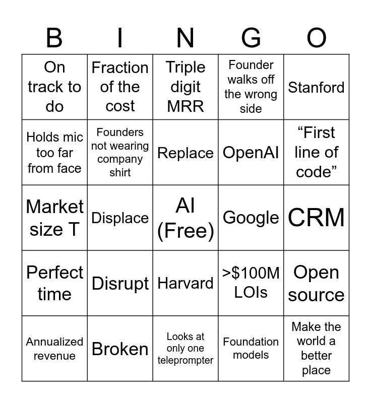 This bingo card has a free space and 24 words: Disrupt, Broken, Replace, Annualized revenue, Stanford, On track to do, Holds mic too far from face, Fraction of the cost, Google, Harvard, OpenAI, Market size T, >$100M LOIs, Open source, Founders not wearing company shirt, Foundation models, CRM, Triple digit MRR, “First line of code”, Displace, Make the world a better place, Perfect time, Founder walks off the wrong side and Looks at only one teleprompter.