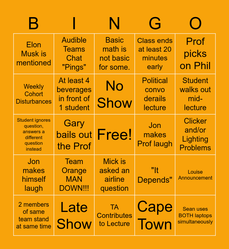 This bingo card has a free space and 24 words: Team Orange MAN DOWN!!!, Late Show, No Show, 2 members of same team stand at same time, Prof picks on Phil, Elon Musk is mentioned, Weekly Cohort Disturbances, Audible Teams Chat "Pings", Jon makes Prof laugh, Mick is asked an airline question, Political convo derails lecture, Student ignores question, answers a different question instead, "It Depends", Louise Announcement, At least 4 beverages in front of 1 student, Cape Town, Clicker and/or Lighting Problems, Basic math is not basic for some., Student walks out mid-lecture, Gary bails out the Prof, Sean uses BOTH laptops simultaneously, Jon makes himself laugh, Class ends at least 20 minutes early and TA Contributes to Lecture.