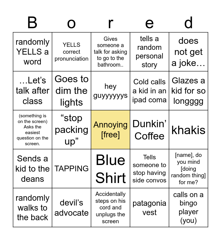 This bingo card has a free space and 24 words: TAPPING, devil’s advocate, hey guyyyyyys, randomly walks to the back, does not get a joke…, randomly YELLS a word, …Let’s talk after class, YELLS correct pronunciation, Dunkin’ Coffee, Blue Shirt, Cold calls a kid in an ipad coma, (something is on the screen) Asks the easiest question on the screen., Tells someone to stop having side convos, [name], do you mind [doing random thing] for me?, Goes to dim the lights, patagonia vest, khakis, Gives someone a talk for asking to go to the bathroom.., Glazes a kid for so longggg, “stop packing up”, calls on a bingo player (you), Sends a kid to the deans, tells a random personal story and Accidentally steps on his cord and unplugs the screen.