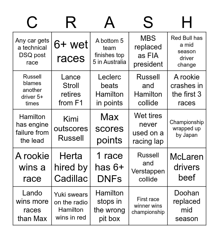 This bingo card has a free space and 24 words: Herta hired by Cadillac, Yuki swears on the radio Hamilton wins in red, Leclerc beats Hamilton in points, Lando wins more races than Max, Red Bull has a mid season driver change, Any car gets a technical DSQ post race, Russell blames another driver 5+ times, 6+ wet races, Wet tires never used on a racing lap, 1 race has 6+ DNFs, Russell and Hamilton collide, Hamilton has engine failure from the lead, Russell and Verstappen collide, McLaren drivers beef, Lance Stroll retires from F1, First race winner wins championship, Championship wrapped up by Japan, A bottom 5 team finishes top 5 in Australia, A rookie crashes in the first 3 races, Kimi outscores Russell, Doohan replaced mid season, A rookie wins a race, MBS replaced as FIA president and Hamilton stops in the wrong pit box.