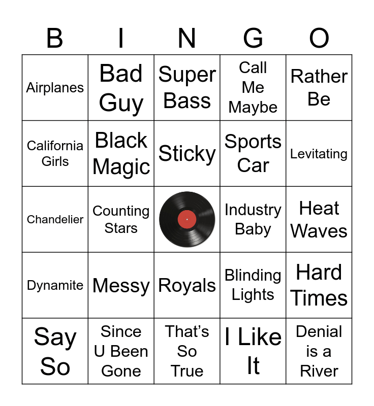 This bingo card has a free space and 50 words: Tití Me Preguntó, Denial is a River, Closer, That’s So True, Messy, Boys, Bad Guy, Water, California Girls, Bad Idea, Right?, Black Magic, Call Me Maybe, Hard Times, Blinding Lights, What Makes You Beautiful, Shape of You, Sticky, Industry Baby, Rolling in the Deep, Rather Be, Counting Stars, I Like It, Airplanes, Sports Car, Troublemaker, Despacito, Levitating, Colors, Super Bass, Royals, Too Sweet, 360, Somebody That I Used to Know, Hot to Go, Since U Been Gone, Joyride, Blank Space, We Are Young, Espresso, Heat Waves, As It Was, Uptown Funk, Squabble Up, Into You, Say So, Chandelier, Rush, DJ Got Us Fallin’ In Love, Dynamite and Mamushi.