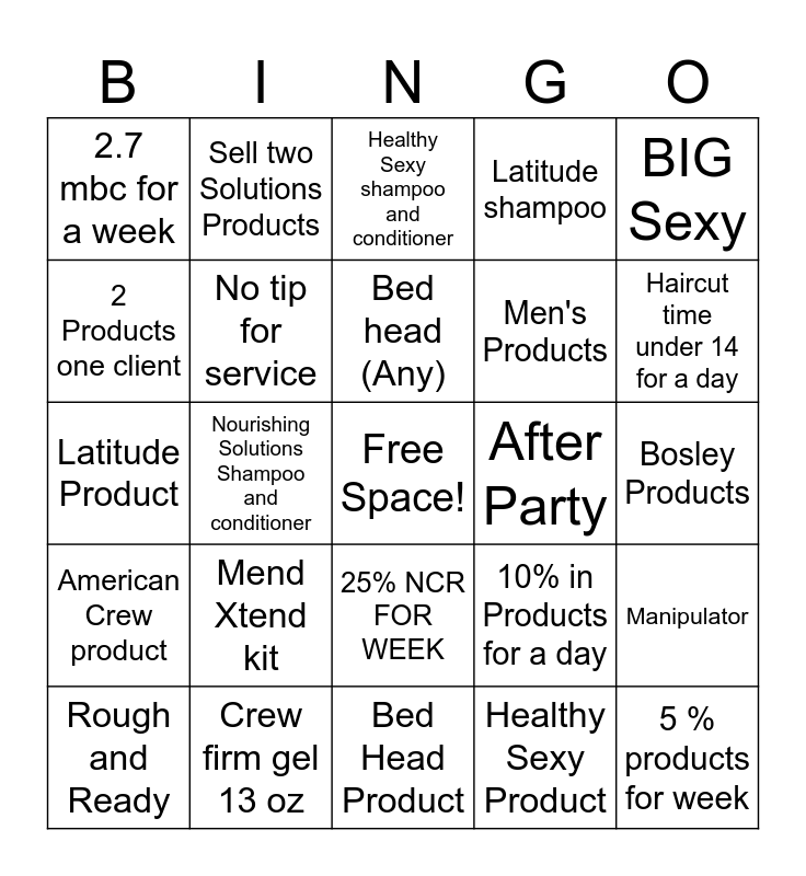 This bingo card has a free space and 24 words: Rough and Ready, Mend Xtend kit, Bed head (Any), Healthy Sexy Product, BIG Sexy, 2.7 mbc for a week, Sell two Solutions Products, Healthy Sexy shampoo and conditioner, After Party, Bosley Products, Latitude Product, No tip for service, 10% in Products for a day, Manipulator, 2 Products one client, Crew firm gel 13 oz, Bed Head Product, Latitude shampoo, Haircut time under 14 for a day, American Crew product, Nourishing Solutions Shampoo and conditioner, 25% NCR FOR WEEK, Men's Products and 5 % products for week.