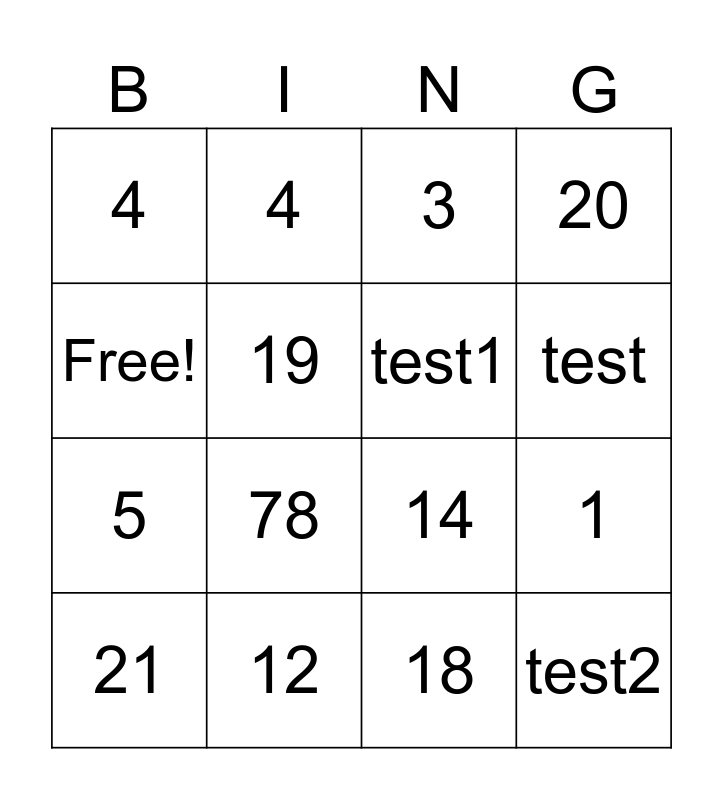 This bingo card has 16 words: 12, 1, 3, 4, 5, 4, 14, 18, Free!, 19, 21, 20, 78, test, test1 and test2.