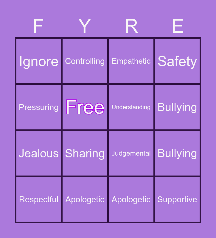 This bingo card has 16 words: Apologetic, Bullying, Empathetic, Ignore, Jealous, Controlling, Judgemental, Apologetic, Pressuring, Free, Respectful, Safety, Sharing, Bullying, Understanding and Supportive.