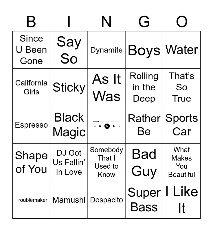 This bingo card has a free space and 50 words: Squabble Up, I Like It, Hot to Go, Despacito, DJ Got Us Fallin’ In Love, Counting Stars, Say So, Hard Times, California Girls, Uptown Funk, Sticky, Boys, What Makes You Beautiful, Bad Guy, Too Sweet, Messy, As It Was, Rather Be, Rush, Water, Black Magic, Super Bass, Since U Been Gone, Rolling in the Deep, Bad Idea, Right?, Chandelier, That’s So True, Tití Me Preguntó, Dynamite, Somebody That I Used to Know, Colors, Heat Waves, 360, Levitating, Mamushi, Closer, Airplanes, Joyride, Royals, Sports Car, We Are Young, Call Me Maybe, Industry Baby, Into You, Troublemaker, Espresso, Blinding Lights, Denial is a River, Shape of You and Blank Space.