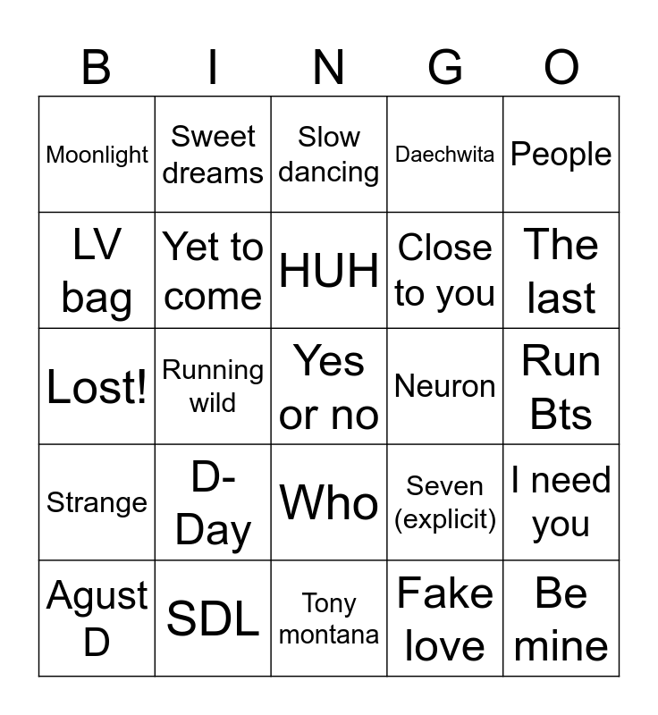 This bingo card has a free space and 24 words: D-Day, SDL, HUH, Agust D, People, Moonlight, LV bag, Sweet dreams, Neuron, Who, Close to you, Lost!, Seven (explicit), I need you, Yet to come, Fake love, Run Bts, Slow dancing, The last, Running wild, Be mine, Strange, Daechwita and Tony montana.