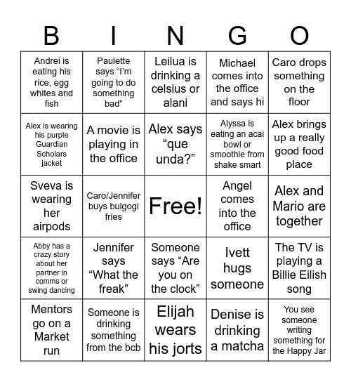This bingo card has a free space and 24 words: Jennifer says “What the freak”, Someone is drinking something from the bcb, Alex says “que unda?”, Mentors go on a Market run, Caro drops something on the floor, Andrei is eating his rice, egg whites and fish, Alex is wearing his purple Guardian Scholars jacket, Paulette says “I’m going to do something bad”, Angel comes into the office, Someone says “Are you on the clock”, Alyssa is eating an acai bowl or smoothie from shake smart, Sveva is wearing her airpods, Ivett hugs someone, The TV is playing a Billie Eilish song, A movie is playing in the office, Denise is drinking a matcha, Alex and Mario are together, Leilua is drinking a celsius or alani, Alex brings up a really good food place, Caro/Jennifer buys bulgogi fries, You see someone writing something for the Happy Jar, Abby has a crazy story about her partner in comms or swing dancing, Michael comes into the office and says hi and Elijah wears his jorts.