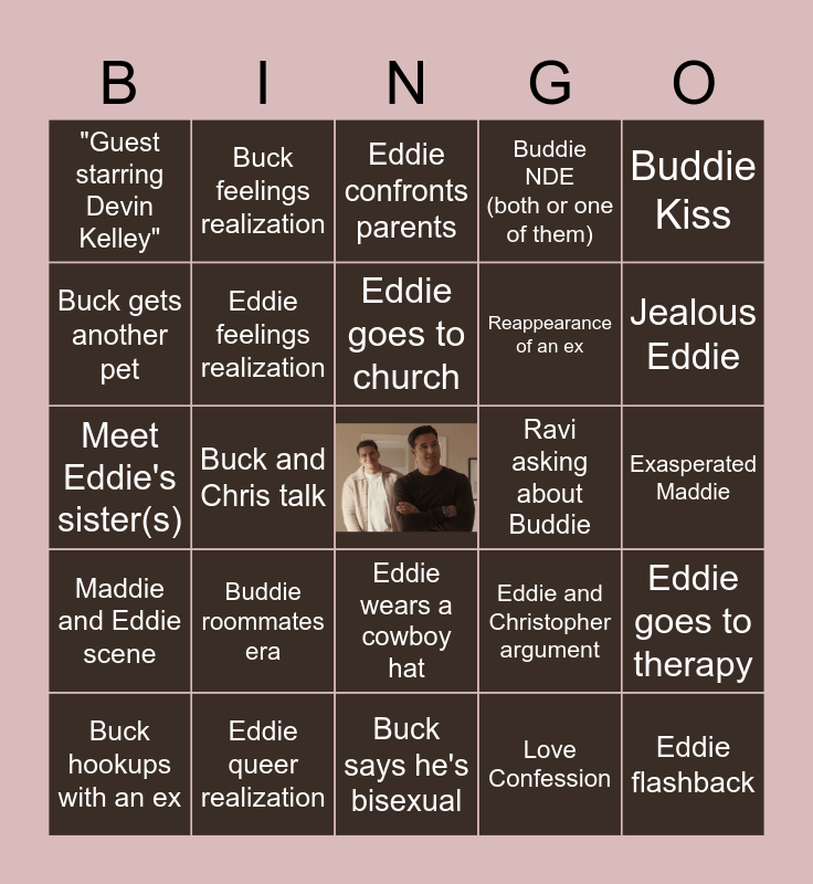 This bingo card has a free space and 24 words: Buddie roommates era, Eddie queer realization, Eddie goes to church, Buck hookups with an ex, Buddie Kiss, "Guest starring Devin Kelley", Buck gets another pet, Buck feelings realization, Ravi asking about Buddie, Eddie wears a cowboy hat, Reappearance of an ex, Meet Eddie's sister(s), Eddie and Christopher argument, Eddie goes to therapy, Eddie feelings realization, Love Confession, Exasperated Maddie, Eddie confronts parents, Jealous Eddie, Buck and Chris talk, Eddie flashback, Maddie and Eddie scene, Buddie NDE (both or one of them) and Buck says he's bisexual.