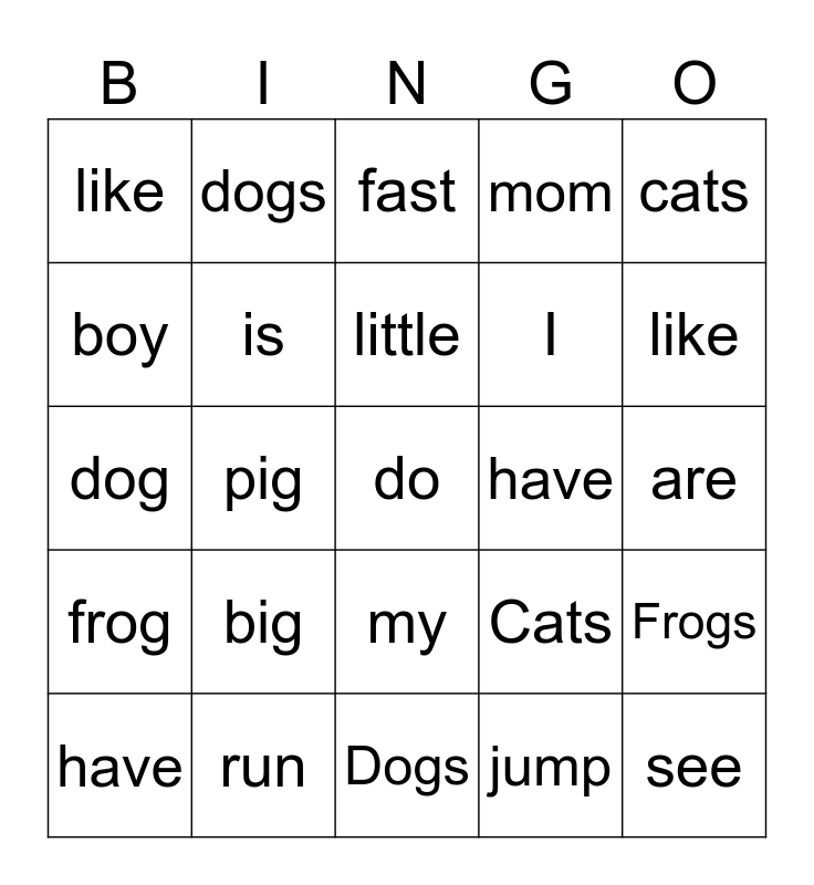This bingo card has 35 words: The, the, can, I, see, like, is, has, have, a, dog, dogs, my, cat, cats, frog, run, fast, jump, are, have, pig, do, not, like, boy, girl, Dogs, Cats, Frogs, My, big, little, mom and dad.