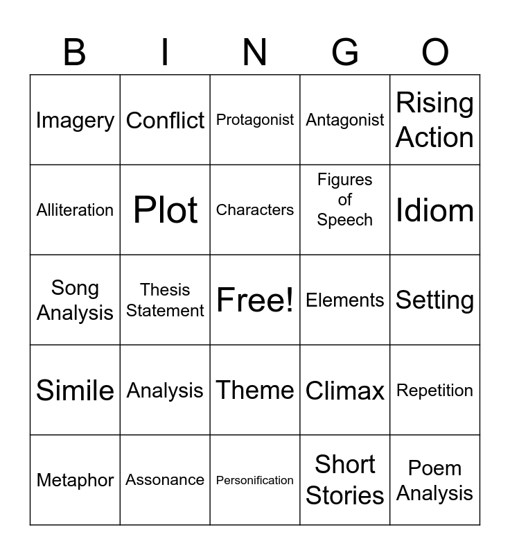 This bingo card has a free space and 24 words: Analysis, Assonance, Characters, Metaphor, Rising Action, Imagery, Alliteration, Conflict, Elements, Theme, Figures of Speech, Song Analysis, Climax, Repetition, Plot, Short Stories, Setting, Protagonist, Idiom, Thesis Statement, Poem Analysis, Simile, Antagonist and Personification.