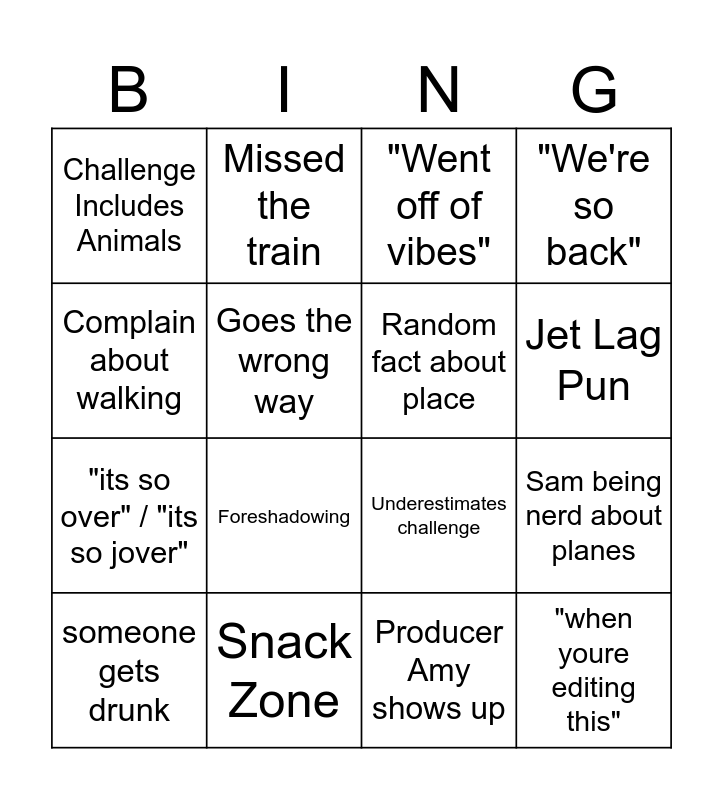 This bingo card has 24 words: Train is delayed, in disguise, Jet Lag Pun, WEEEEEEEE, Complain about walking, Challenge Includes Animals, Goes the wrong way, Missed the train, Snack Zone, Having to take a photo of a bird, "its so over" / "its so jover", Underestimates challenge, Eats at fast food place, Ben and Adam Chant, Random fact about place, Adam goes to a castle / old building, Producer Amy shows up, "Went off of vibes", Foreshadowing, Sam being nerd about planes, someone gets drunk, "when youre editing this", "We're so back" and Adam says "its fine, we're fine" but its really not fine.