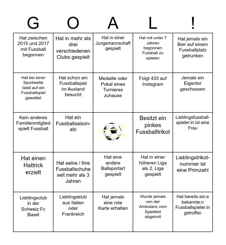 This bingo card has a free space and 30 words: Lieblingsklub aus Italien oder Frankreich, Trägt Puma-Fussballschuhe, Hat ein Fussballsaison- abi, War in einem Stadion mit > 40'000 Plätzen, Hat zwischen 2015 und 2017 mit Fussball begonnen, Hat in einer Jungsmannschaft gespielt, Hat schon ein Fussballspiel im Ausland besucht, Hat eine andere Ballsportart gespielt, Besitzt ein pinkes Fussballtrikot, Hat jemals eine rote Karte erhalten, Lieblingsfussball- spieler:in ist eine Frau, Hat bereits ein:e bekannte:n Fussballspieler:in getroffen, Wurde jemals von der Ambulanz vom Spielfeld abgeholt, Hat jemals die Fussballschuhe an einem Match vergessen, Jemals ein Eigentor geschossen, War an einem EM, WM oder Championsleague- spiel, Hat in einer höheren Liga als 2. Liga gespielt, Hat einen Hattrick erzielt, Hat seine / ihre Fussballschuhe seit mehr als 3 Jahren, Hat jemals ein Bier auf einem Fussballplatz getrunken, Kein anderes Familienmitglied spielt Fussball, Ist Linksfüsser:in, Hat in mehr als drei verschiedenen Clubs gespielt, Folgt 433 auf Instagram, Hat bei einer Sportwette Geld auf ein Fussballspiel gewettet, Hat mit unter 7 Jahren begonnen Fussball zu spielen, Lieblingstrikot- nummer ist eine Primzahl, Lieblingsclub in der Schweiz Fc Basel, Medaille oder Pokal eines Turnieres zuhause and Kann mehr als 30 x jonglieren (Fuss).