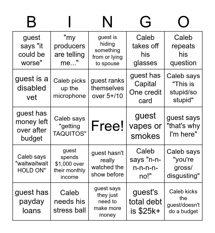 This bingo card has a free space and 24 words: guest spends $1,000 over their monthly income, Caleb needs his stress ball, guest ranks themselves over 5+/10, guest has payday loans, Caleb repeats his question, guest says "it could be worse", guest is a disabled vet, "my producers are telling me...", guest vapes or smokes, guest hasn't really watched the show before, guest has Capital One credit card, guest has money left over after budget, Caleb says "n-n-n-n-n-n-no!", Caleb says "you're gross/ disgusting", Caleb picks up the microphone, guest's total debt is $25k+, guest says "that's why I'm here", guest is hiding something from or lying to spouse, Caleb says "This is stupid/so stupid", Caleb says "getting TAQUITOS", Caleb kicks the guest/doesn't do a budget, Caleb says "waitwaitwait HOLD ON", Caleb takes off his glasses and guest says they just need to make more money.