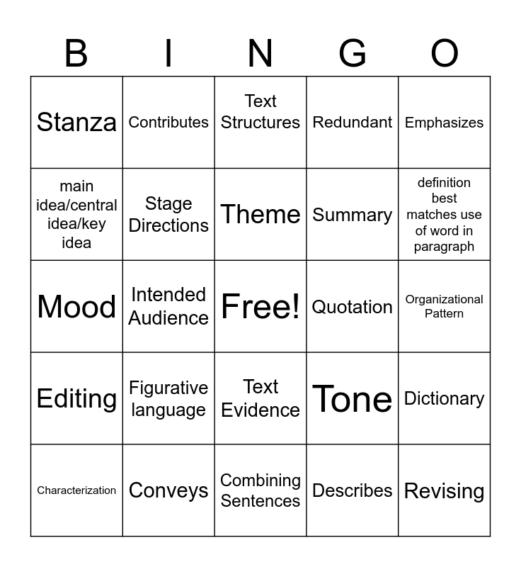 This bingo card has a free space and 24 words: Figurative language, Conveys, Theme, Characterization, Emphasizes, Stanza, main idea/central idea/key idea, Contributes, Quotation, Text Evidence, Summary, Mood, Tone, Dictionary, Stage Directions, Describes, Organizational Pattern, Text Structures, definition best matches use of word in paragraph, Intended Audience, Revising, Editing, Redundant and Combining Sentences.