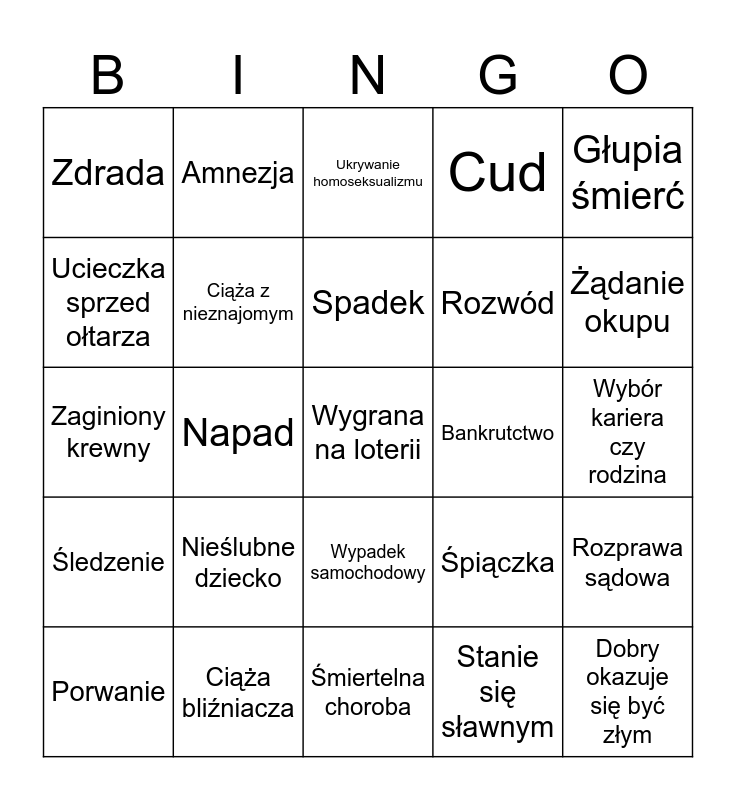 This bingo card has a free space and 24 words: Nieślubne dziecko, Ciąża bliźniacza, Spadek, Porwanie, Głupia śmierć, Zdrada, Ucieczka sprzed ołtarza, Amnezja, Bankrutctwo, Wypadek samochodowy, Rozwód, Zaginiony krewny, Śpiączka, Rozprawa sądowa, Ciąża z nieznajomym, Stanie się sławnym, Wybór kariera czy rodzina, Ukrywanie homoseksualizmu, Żądanie okupu, Napad, Dobry okazuje się być złym, Śledzenie, Cud and Śmiertelna choroba.