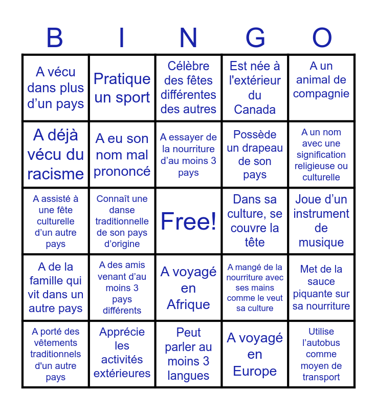 This bingo card has a free space and 29 words: Est végétarienne, Apprécie les activités extérieures, Célèbre des fêtes différentes des autres, A un ancêtre autochtone, A un animal de compagnie, A vécu dans plus d’un pays, A eu son nom mal prononcé, A essayer de la nourriture d’au moins 3 pays, Dans sa culture, se couvre la tête, Met de la sauce piquante sur sa nourriture, A porté des vêtements traditionnels d'un autre pays, Connaît une danse traditionnelle de son pays d’origine, A voyagé en Europe, Utilise l’autobus comme moyen de transport, A assisté à une fête culturelle d’un autre pays, Porte ses vêtements traditionnels, Peut parler au moins 3 langues, A mangé de la nourriture avec ses mains comme le veut sa culture, A un nom avec une signification religieuse ou culturelle, A de la famille qui vit dans un autre pays, A des amis venant d’au moins 3 pays différents, A voyagé en Asie, Possède un drapeau de son pays, Joue d’un instrument de musique, A déjà vécu du racisme, Pratique un sport, A voyagé en Afrique, Est née à l'extérieur du Canada and A voyagé en Amérique du Sud.