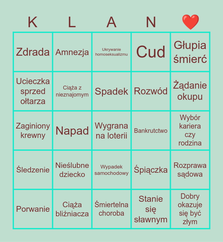 This bingo card has a free space and 24 words: Nieślubne dziecko, Ciąża bliźniacza, Spadek, Porwanie, Głupia śmierć, Zdrada, Ucieczka sprzed ołtarza, Amnezja, Bankrutctwo, Wypadek samochodowy, Rozwód, Zaginiony krewny, Śpiączka, Rozprawa sądowa, Ciąża z nieznajomym, Stanie się sławnym, Wybór kariera czy rodzina, Ukrywanie homoseksualizmu, Żądanie okupu, Napad, Dobry okazuje się być złym, Śledzenie, Cud and Śmiertelna choroba.