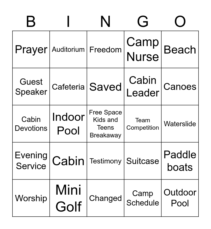 This bingo card has a free space and 30 words: Worship, Activity Director's Dream, Freedom, Carpool, Beach, Prayer, Cafeteria, Saved, Suitcase, Outdoor Pool, Evening Service, Cabin, Sleeping Bag, Beach Inflatables, Cabin Devotions, Activity Center, Changed, Camp Schedule, Waterslide, Guest Speaker, Indoor Pool, Testimony, Camp Nurse, Canoes, Auditorium, Cabin Leader, Paddle boats, Mini Golf, Team Competition and New friends.
