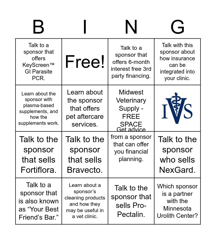 This bingo card has 2 images and 17 words: Get advice from a sponsor that can offer you financial planning., Talk to a veterinary diagnostics company that also offers practice management software., Talk to a sponsor that offers 6-month interest free 3rd party financing., Which sponsor is a partner with the Minnesota Urolith Center?, Talk to the sponsor who sells NexGard., Learn about the sponsor with plasma-based supplements, and how the supplements work., Talk to the sponsor that sells Pro-Pectalin., Talk to a sponsor that offers KeyScreen™ GI Parasite PCR., Free!, Talk to the sponsor that sells Fortiflora., Talk to the sponsor that sells Bravecto., Learn about the sponsor that offers pet aftercare services., Midwest Veterinary Supply - FREE SPACE, Learn about a sponsor’s cleaning products and how they may be useful in a vet clinic., Talk to a sponsor that is also known as “Your Best Friend’s Bar.”, Learn about the different cleaning services this sponsor offers. and Talk with this sponsor about how insurance can be integrated into your clinic..