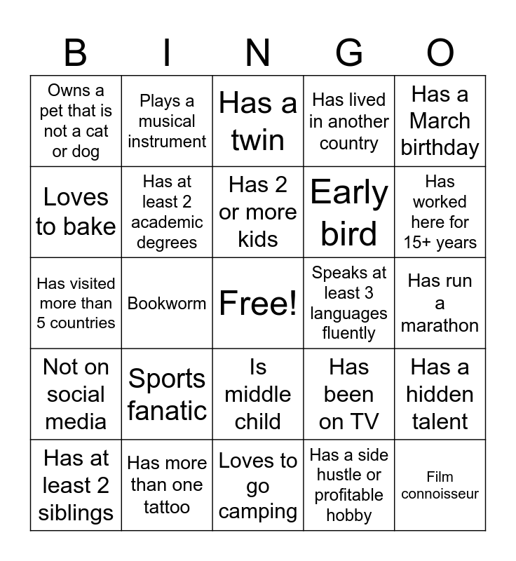 This bingo card has a free space and 24 words: Sports fanatic, Has more than one tattoo, Has 2 or more kids, Has at least 2 siblings, Has a March birthday, Owns a pet that is not a cat or dog, Loves to bake, Plays a musical instrument, Speaks at least 3 languages fluently, Is middle child, Early bird, Has visited more than 5 countries, Has been on TV, Has a hidden talent, Has at least 2 academic degrees, Has a side hustle or profitable hobby, Has run a marathon, Has a twin, Has worked here for 15+ years, Bookworm, Film connoisseur, Not on social media, Has lived in another country and Loves to go camping.