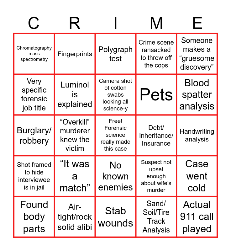 This bingo card has a free space and 36 words: Store receipt used as evidence /alibi, "The day began like no other", Small Town Vibes, Luminol is explained, Suspect not upset enough about wife’s murder, Shot framed to hide interviewee is in jail, Camera shot of cotton swabs looking all science-y, Cop has a mustache, Someone makes a “gruesome discovery”, They use CODIS, “Overkill” murderer knew the victim, Crime scene ransacked to throw off the cops, Affair, Debt/ Inheritance/ Insurance, Blood spatter analysis, Chromatography mass spectrometry, Life in prison without parole, “It was a match”, Actual 911 call played, Polygraph test, Handwriting analysis, Case went cold, Air-tight/rock solid alibi, Found body parts, Stab wounds, Fingerprints, Burglary/ robbery, Female kills male, Pets, Very specific forensic job title, Fire, Bullet grove analysis, Sand/ Soil/Tire Track Analysis, No known enemies, No murder weapon found and “S/he lit up the room”.