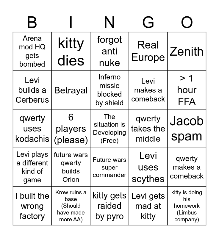 This bingo card has a free space and 24 words: future wars qwerty builds Orion, Krow ruins a base (Should have made more AA), Inferno missle blocked by shield, I built the wrong factory, Zenith, Arena mod HQ gets bombed, Levi builds a Cerberus, kitty dies, qwerty takes the middle, Future wars super commander, Levi makes a comeback, qwerty uses kodachis, Levi uses scythes, qwerty makes a comeback, Betrayal, Levi gets mad at kitty, Jacob spam, forgot anti nuke, > 1 hour FFA, 6 players (please), kitty is doing his homework (Limbus company), Levi plays a different kind of game, Real Europe and kitty gets raided by pyro.