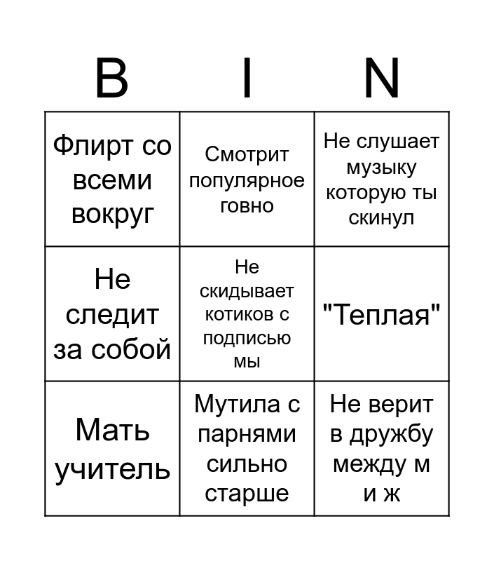This bingo card has a free space and 48 words: Курит, Хочет анал от тебя, Не отошла от прошлых отношений, Рассталась недавно, Младше на два года, Слушает ру реп попсу, Смотрит популярное говно, Много пьет/бухает, "Теплая", "Цбшница", Мать учитель, Не следит за собой, Плохое чувство юмора, Игнор и долгие ответы, Отношение к паузе в отношениях, Ушла к тебе от кого-то или когда то так делала, Мутила с парнями сильно старше, Не пишет первая, Яойщица, Не верит в дружбу между м и ж, Неумение слушать, Было многие партнеров за короткий срок, Флирт со всеми вокруг, Общается с бывшими, Не тактильная, Не шарит за мемы, Избегающий тип привязанности, Не зовет гулять первой, Не готова заплатить за себя или своего парня, Не дарит подарки, Не нравится Everlong, Нравится бандитская тематика, Не видит своего будущего, На аватарке в тг какой то кринж, Смущается от пошлых шуток, Не говорит комплименты, Доебы за внешность, Использует слишком много стикеров, Обсирает бывших, Передружба/недоотношения, Слушает Enina24, Не согласна смотреть фильмы/сериалы которые ты предложил, Не слушает музыку которую ты скинул, Отношение к смерти как к чему то сокровенному, Не готова работать над отношениями, Не готова поехать с тобой на край света, Просит себя таскать везде с собой and Не готова тратить на тебя время.