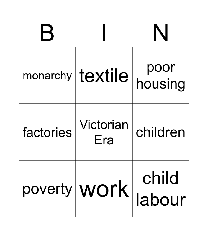 This bingo card has a free space and 14 words: revolution, urban, poverty, textile, factories, child labour, industrial, innovation, work, monarchy, queen Victoria, children, poor housing and women.