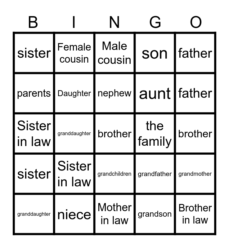 ⚠ This card has duplicate items: Brother in law (2), Sister in law (2), Female cousin (2), Wife (2), Daughter (2), son (2), grandmother (2), grandfather (2), husband (2), mother (2), nephew (2), uncle (2), father (2), granddaughter (2), grandson (2), sister (2), aunt (2)