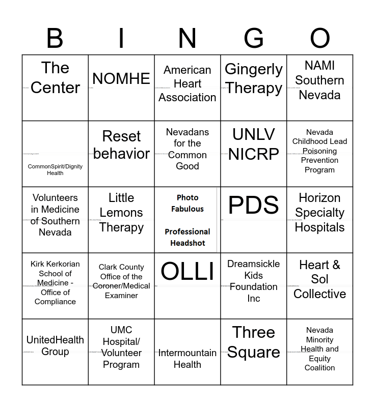 This bingo card has 25 images, a free space and 25 words: UnitedHealth Group, Clark County Office of the Coroner/Medical Examiner, Nevadans for the Common Good, Three Square, Nevada Childhood Lead Poisoning Prevention Program, The Center, NOMHE, American Heart Association, UNLV NICRP, Heart & Sol Collective, Volunteers in Medicine of Southern Nevada, Reset behavior, Dreamsickle Kids Foundation Inc, Nevada Minority Health and Equity Coalition, CommonSpirit/Dignity Health, UMC Hospital/ Volunteer Program, Intermountain Health, Gingerly Therapy, Horizon Specialty Hospitals, Kirk Kerkorian School of Medicine - Office of Compliance, Little Lemons Therapy, OLLI, PDS, NAMI Southern Nevada and Nevada Clinicians for Climate Action.